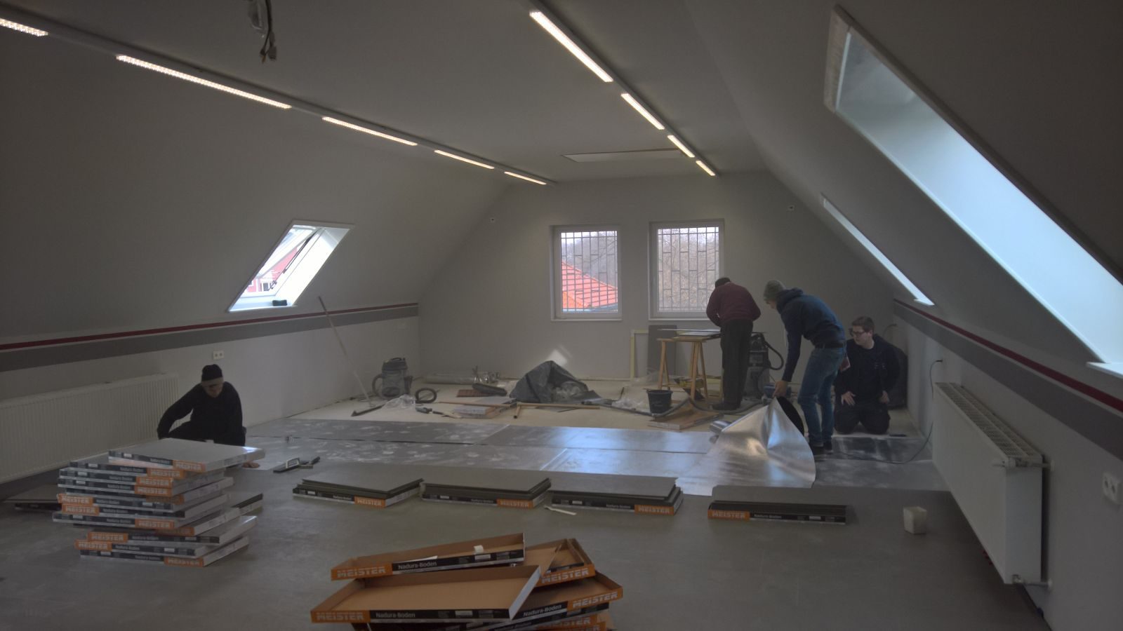 VERLEGUNG DES NEUEN FUßBODENS IM UNTERRICHTSRAUM Heute Morgen um 9 Uhr traf sich eine motivierte Gruppe um den neuen